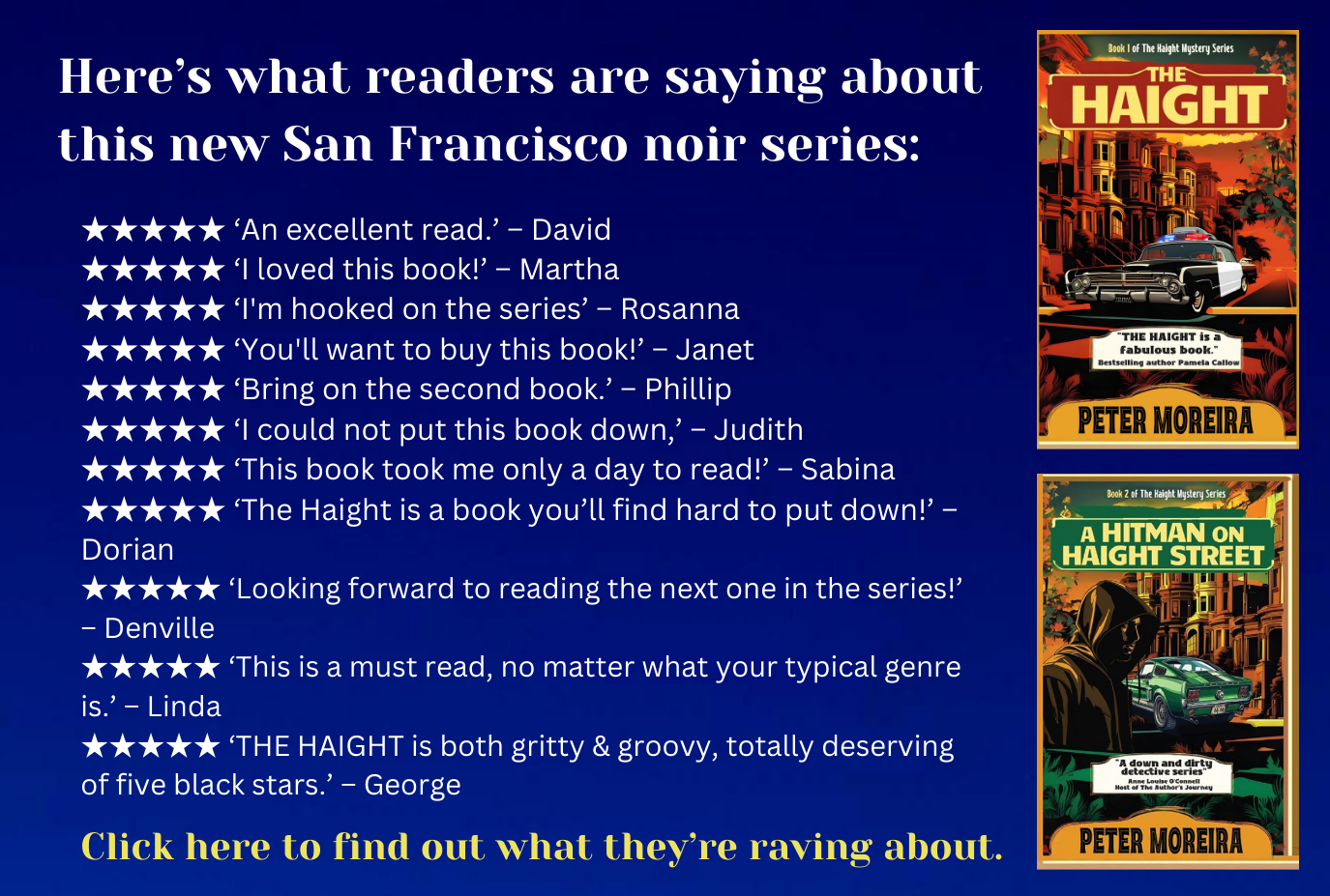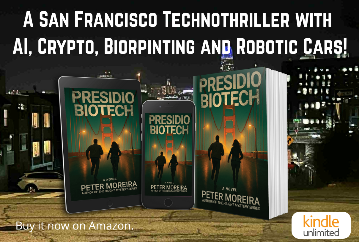 Peter Moreira’s latest novel is the technothriller Presidio Biotech. He is also the author of The Haight Mystery Series — retro mystery novels set in San Francisco in the late 1960s. Go to my home page to join my mailing list and receive a free prequel novella.